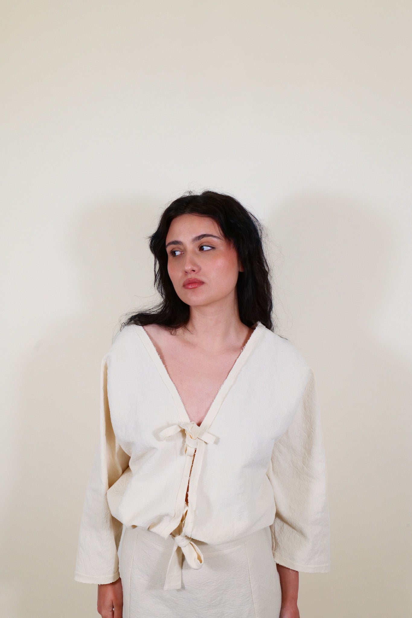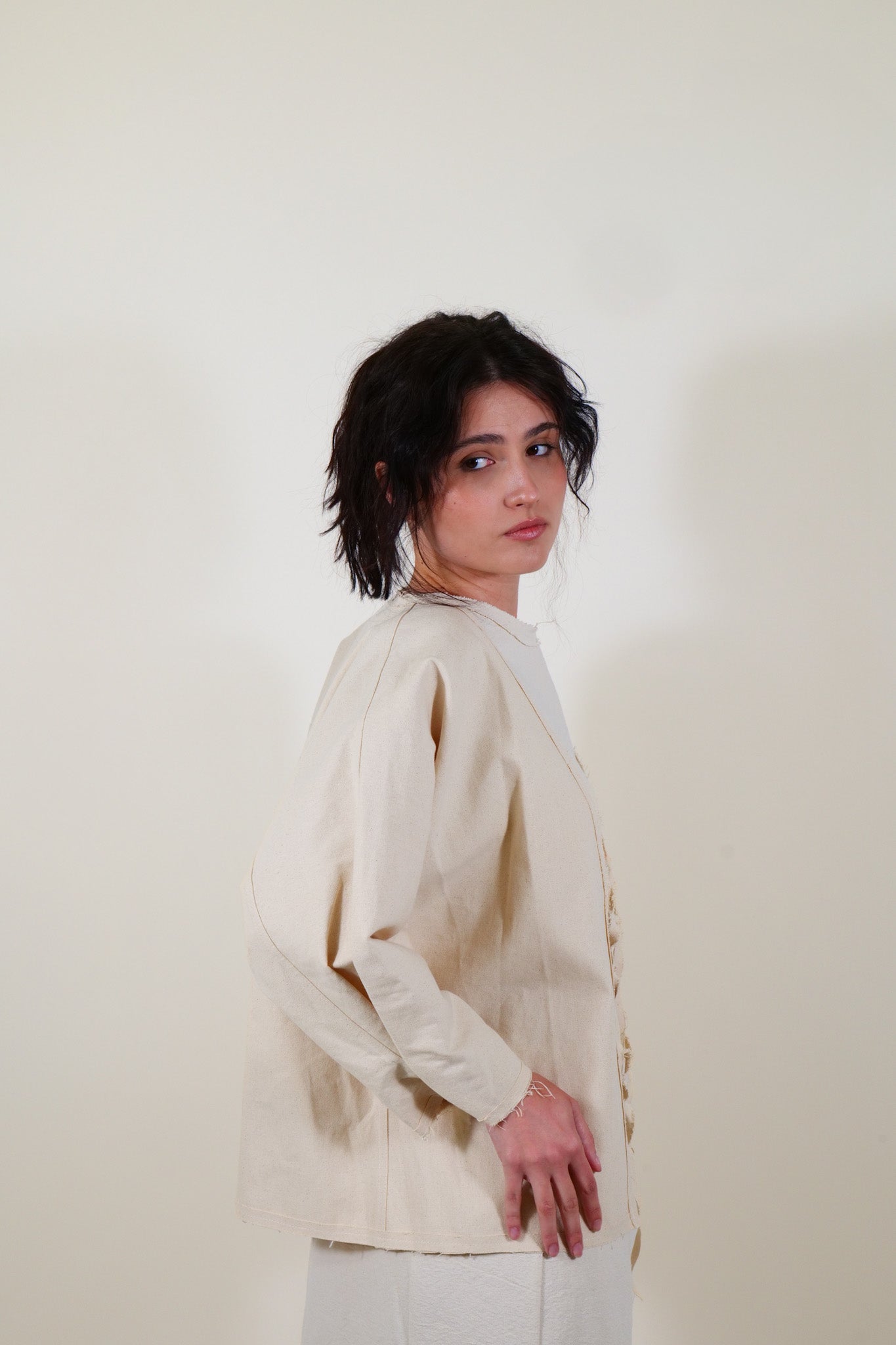 Un kimono cu croială lejeră și detalii sculpturale remarcabile, realizat din 100% bumbac netratat, cu aplicații florale volumetrice, decupate și montate manual. Designul este minimalist, dar expresiv, axat pe textura materialului și volumul creat de florile 3D de pe mâneci și față. Marginile sunt finisate cu tăieturi brute, subliniind naturalețea și caracterul artizanal al piesei.